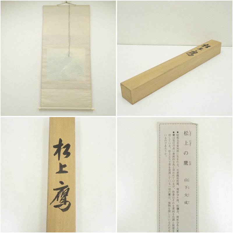 山下大成筆 松上鷹 肉筆絹本掛軸(共箱)