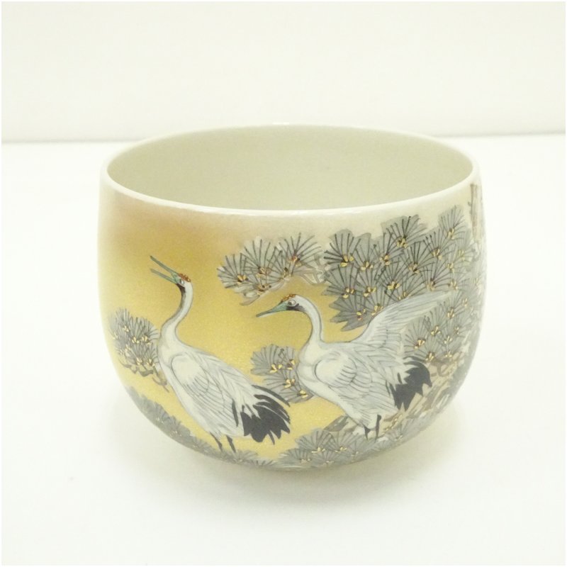 九谷焼 龍山造 金彩双鶴図茶碗(保護箱)