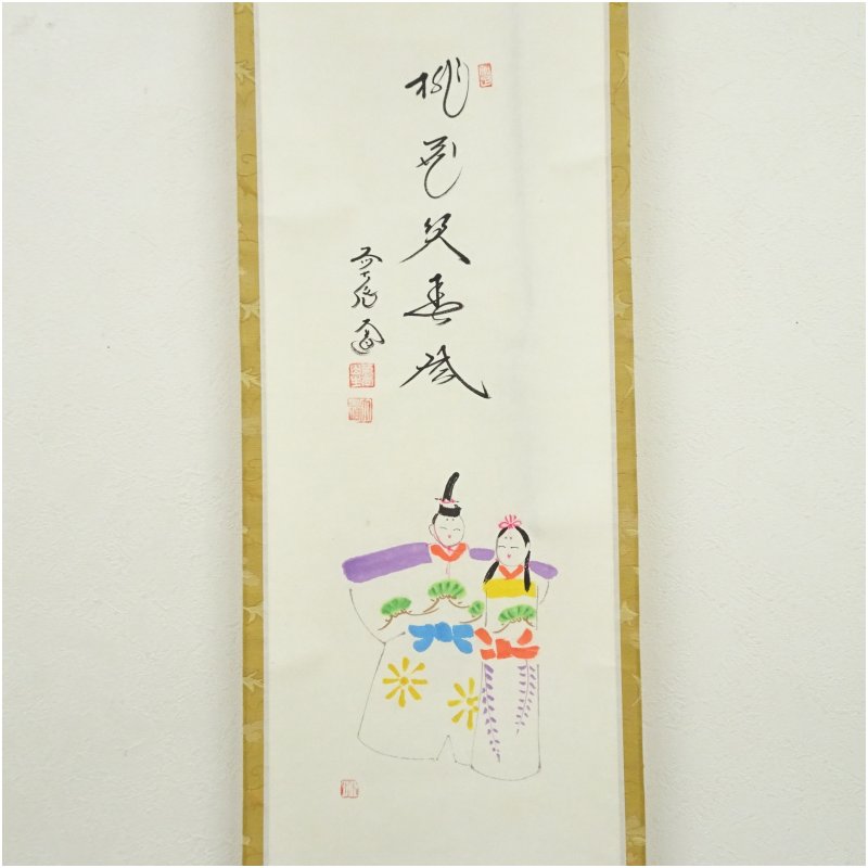 前大徳 西垣大道筆 「桃花笑春風」立雛画賛 肉筆紙本掛軸(共箱) [13-251015c-005a]