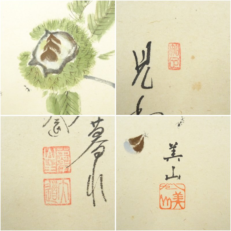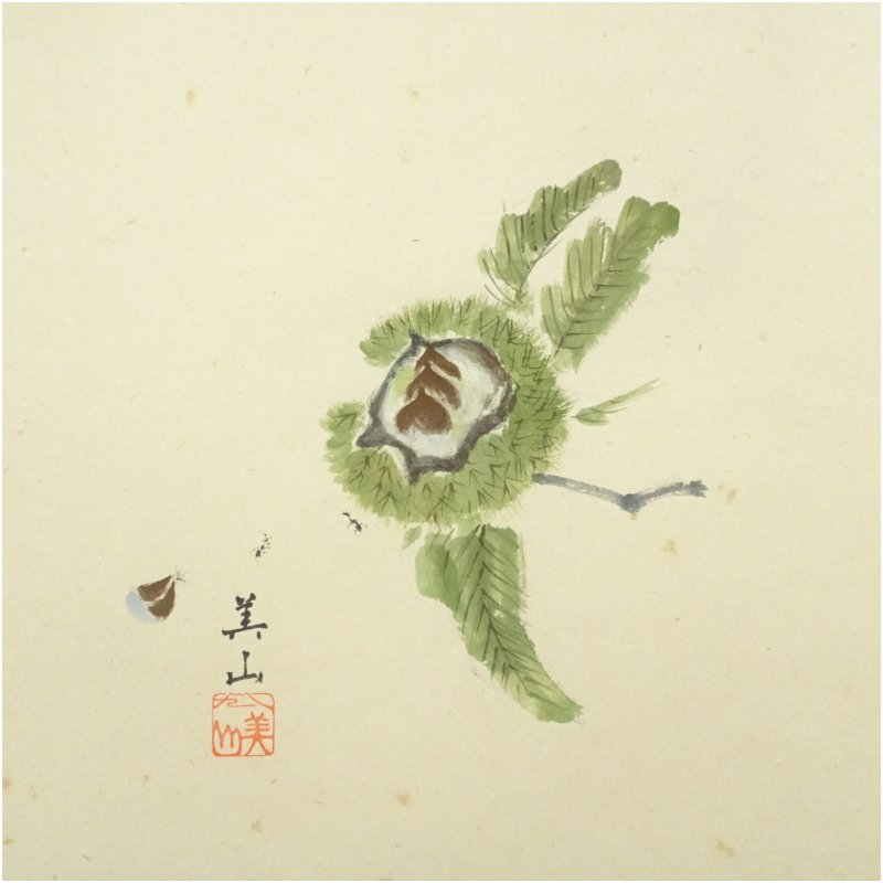 前大徳 西垣大道筆 和歌 美山筆 栗画賛 肉筆紙本掛軸(共箱) [13-251015c-023a]