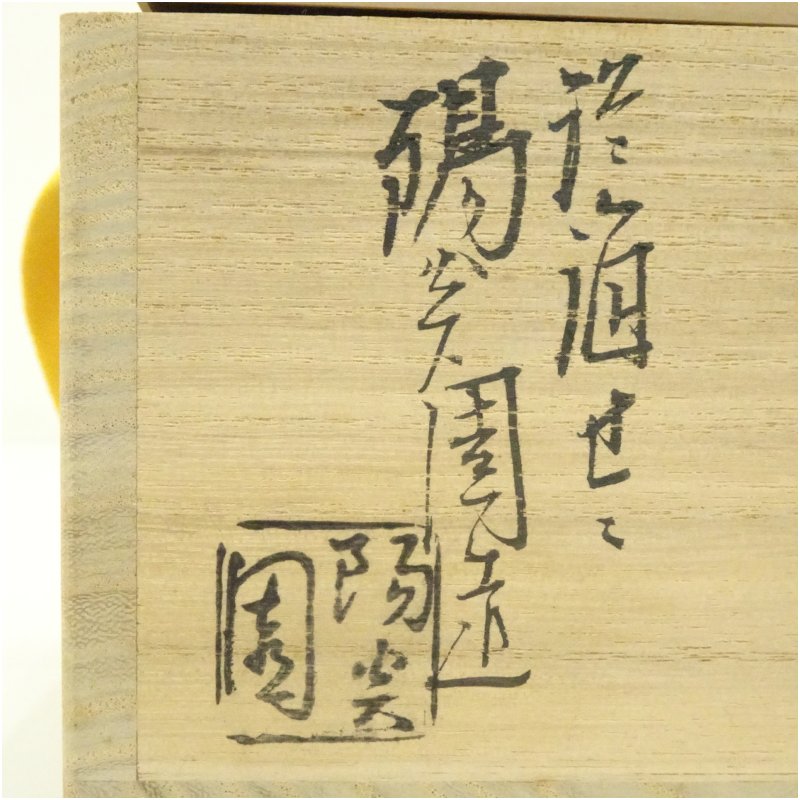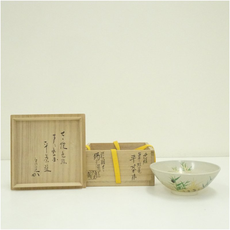 膳所焼 岩崎新定造 色絵芦に蛇篭文平茶碗(堀内家十二代宗完兼中斎書付)(共箱)