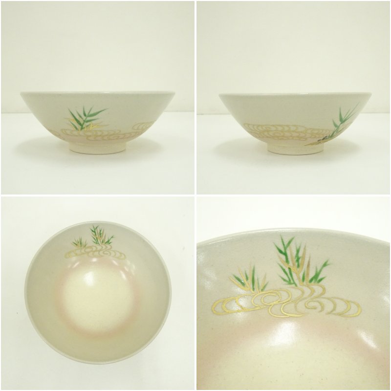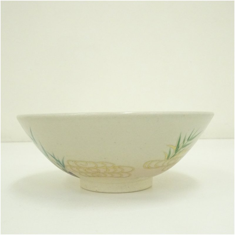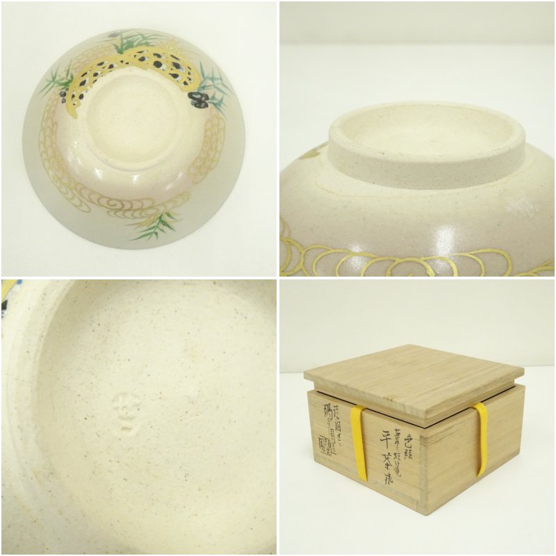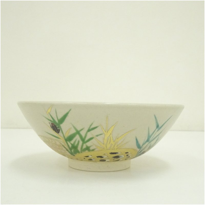膳所焼 岩崎新定造 色絵芦に蛇篭文平茶碗(堀内家十二代宗完兼中斎書付)(共箱) [12-251015c-050a]