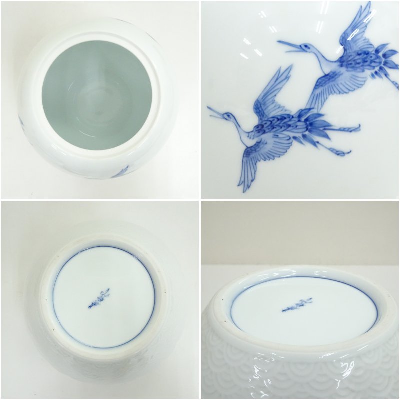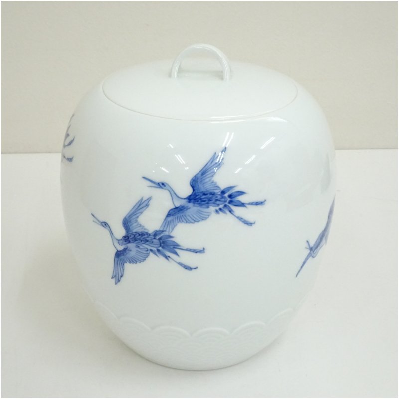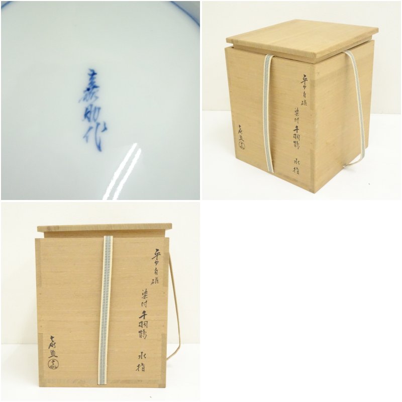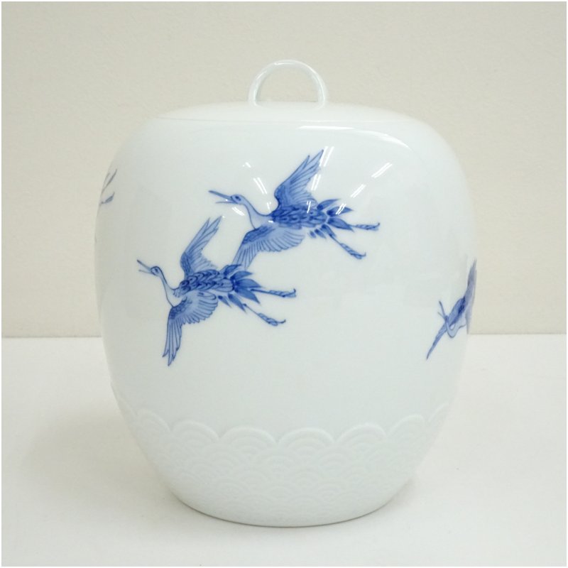 平戸焼 横石嘉助造 白磁染付千羽鶴水指(共箱) [13-251015d-044a]