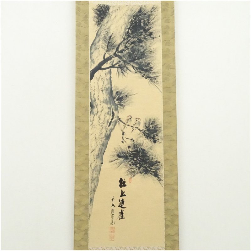 前大徳 須賀玄道筆 「松上連雀」画賛 肉筆紙本掛軸(共箱) [13-251017c-004a]