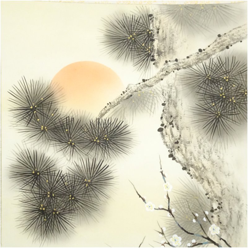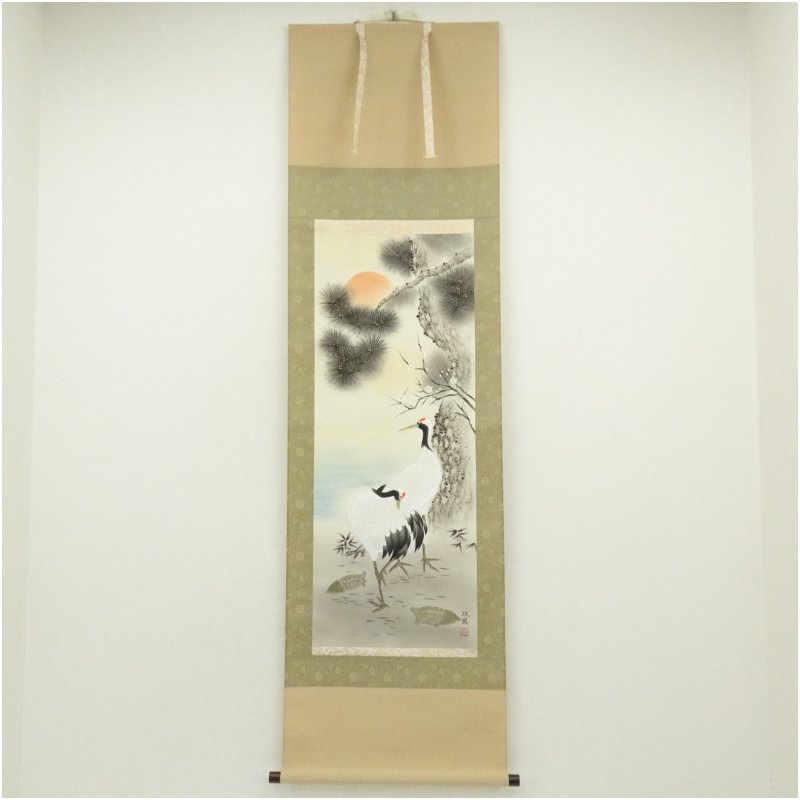 西原双鳳筆 松竹梅鶴亀 肉筆絹本掛軸(共箱) [01-251021a-015a]
