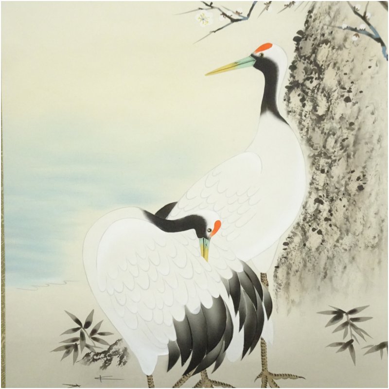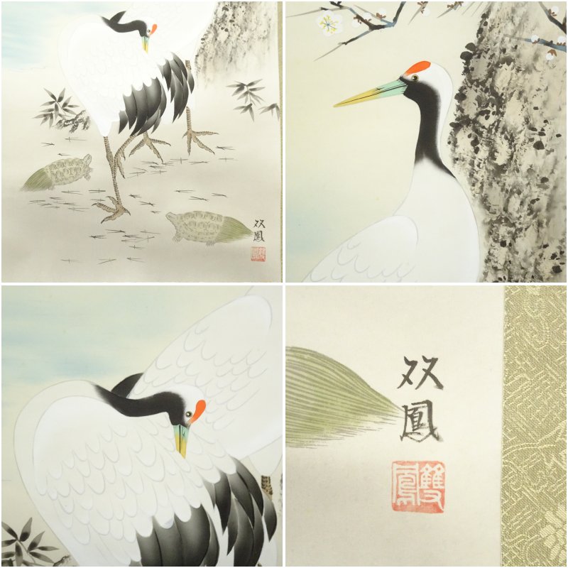西原双鳳筆 松竹梅鶴亀 肉筆絹本掛軸(共箱)