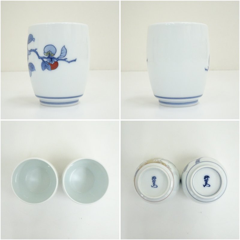 有田焼 酒井田垣右衛門造 錦菊鳥文湯呑・柿文湯呑 柄違い2客(保護箱)