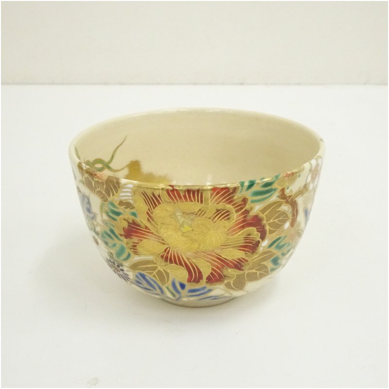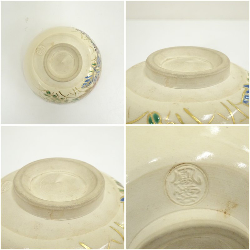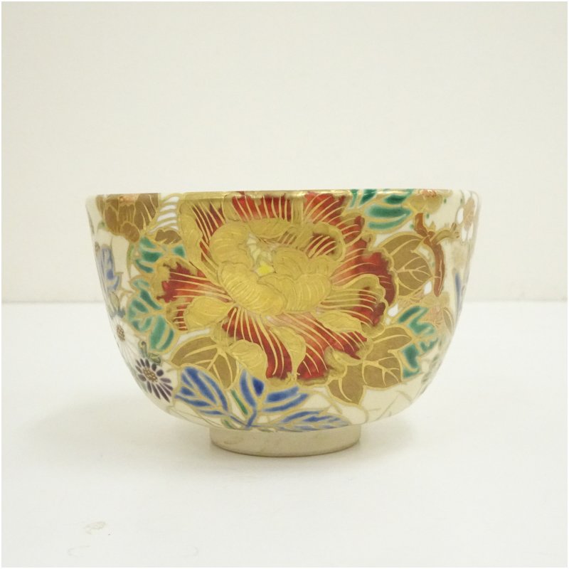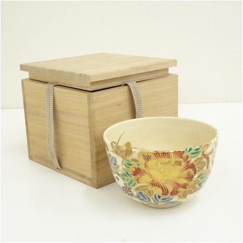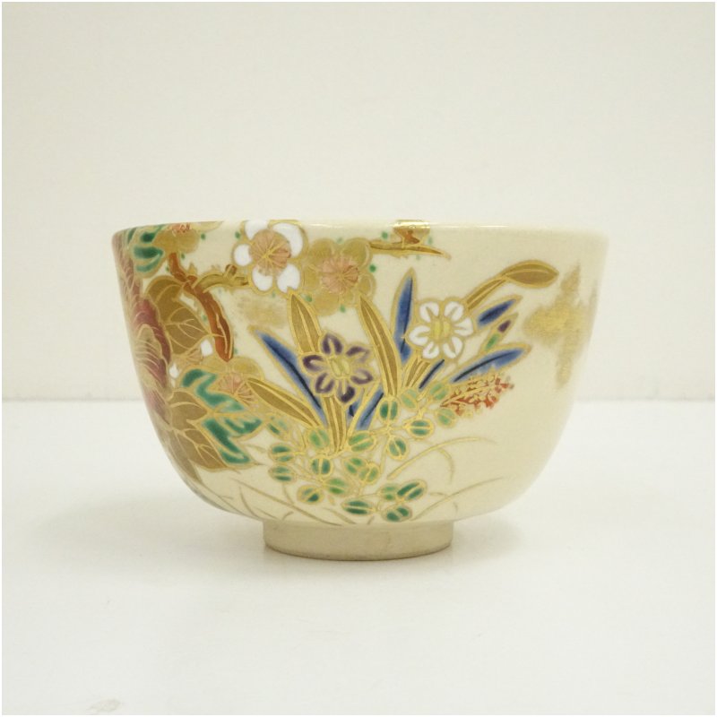 鳳雲造 金彩色絵四季草花文茶碗(保護箱)
