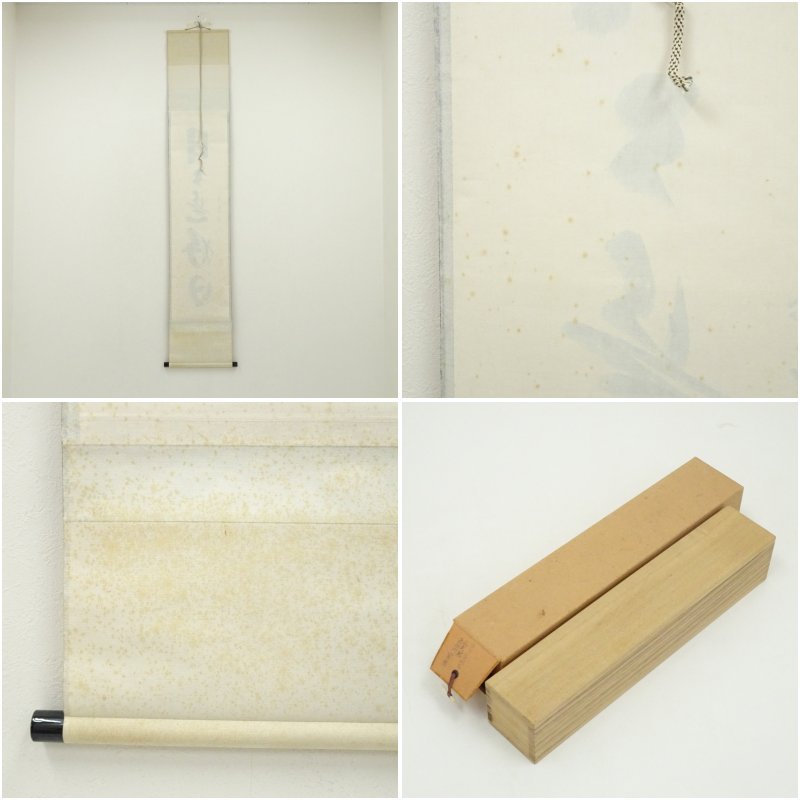 本紙と表具裏面に、下部を中心に全体的にシミがあります。