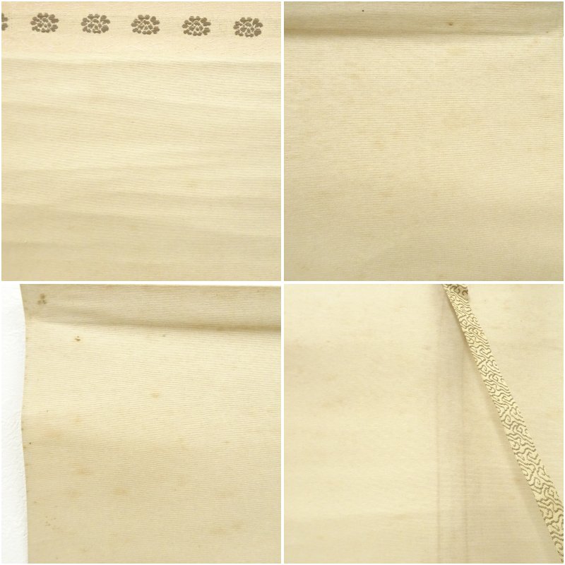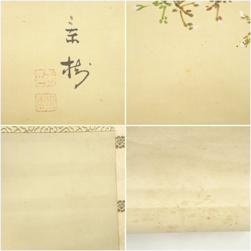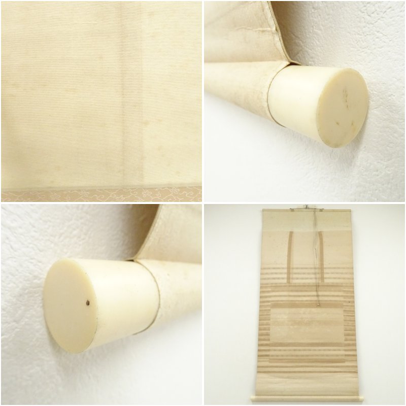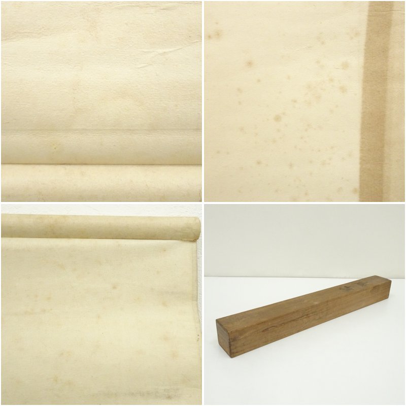 表具:両面全体にシミと巻き皺があります。風帯部分と裏面全体にヤケがあります。