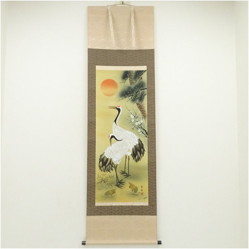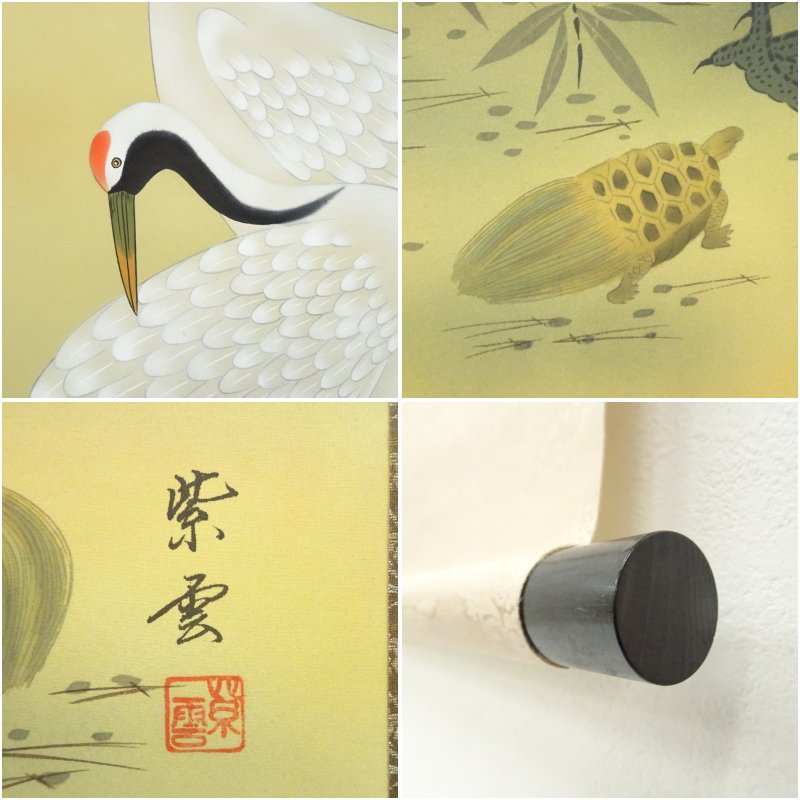 紫雲筆 松竹梅鶴亀 肉筆絹本掛軸(箱付) [01-251027c-001a]