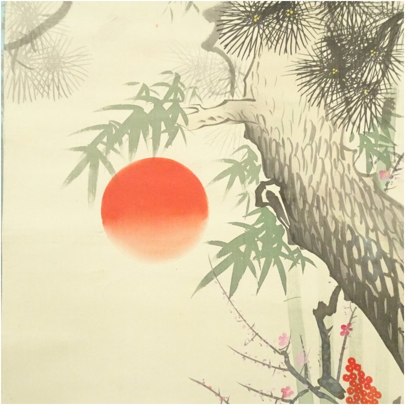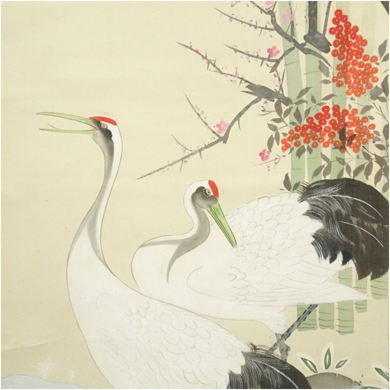 仙樵筆 松竹梅鶴亀 肉筆絹本掛軸(共箱)
