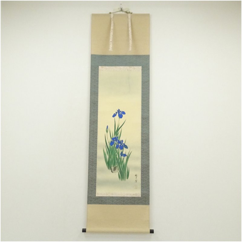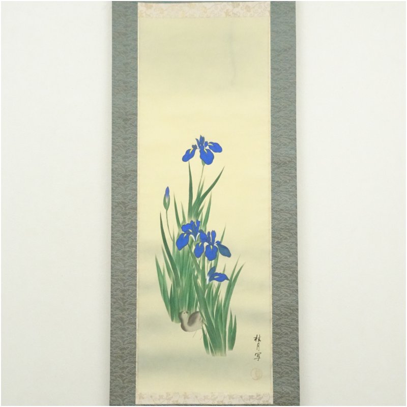 桂月筆 菖蒲に小禽 肉筆絹本掛軸(保護箱) [01-251030c-039a]