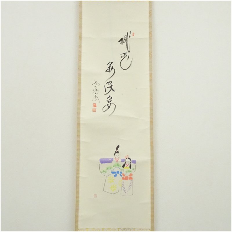 前大徳 西垣大道筆 「桃花萬家宴」木水筆 雛画賛 肉筆絹本掛軸(共箱)