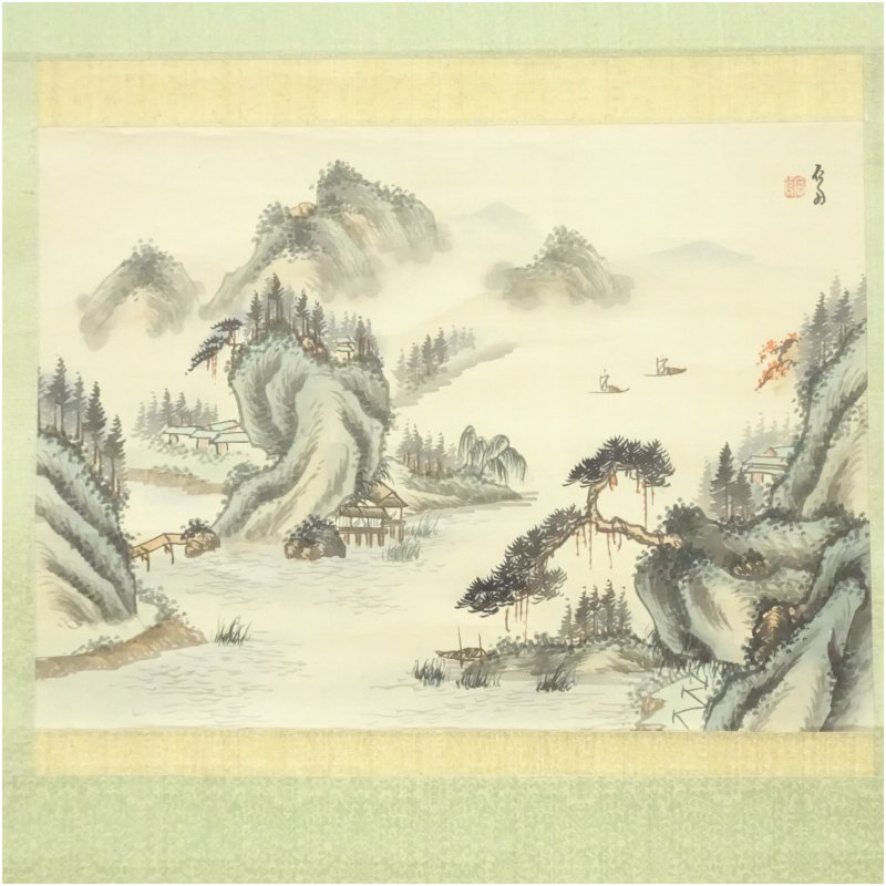 作家物 彩色山水 肉筆絹本掛軸(箱付) [01-251104c-039a]