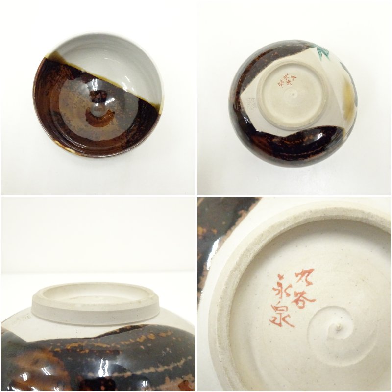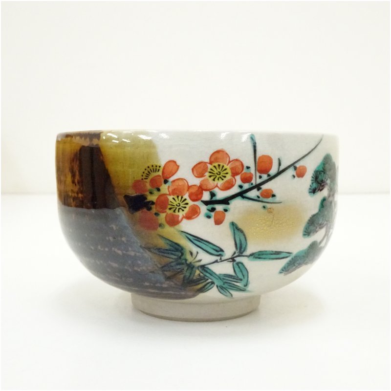 九谷焼 永泉造 色絵松竹梅文掛分茶碗