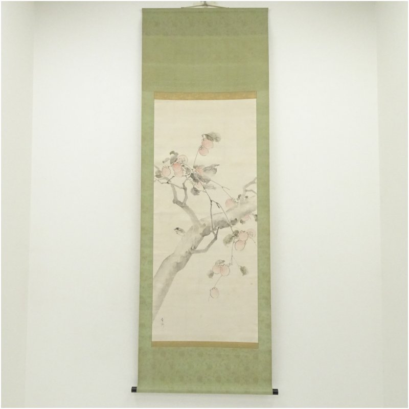 田中雪渓筆 柿に鳥 肉筆紙本掛軸(保護箱)