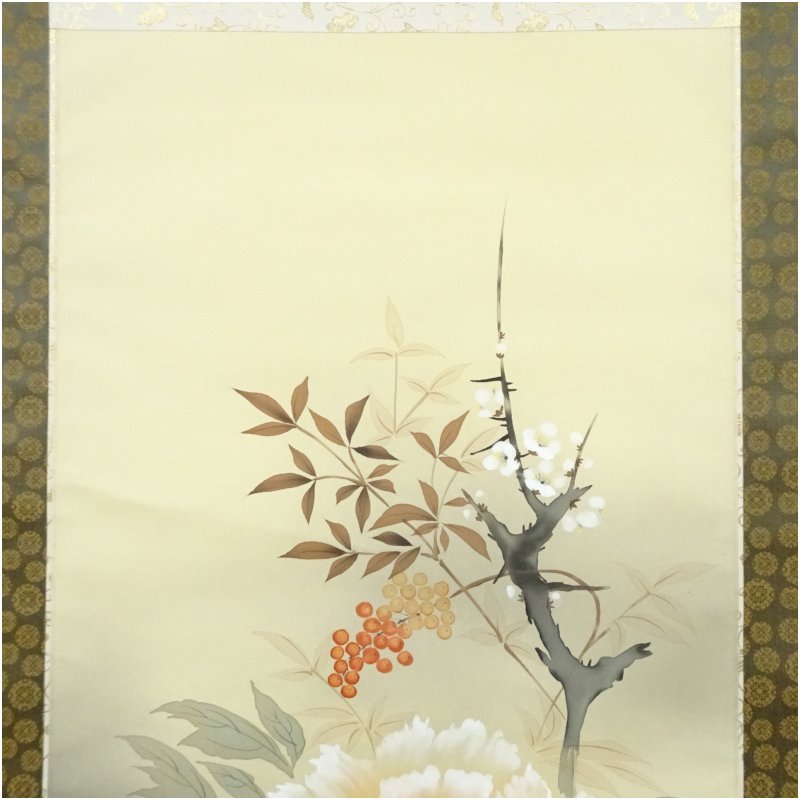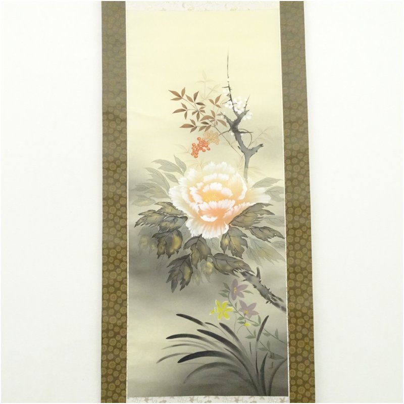 雅美筆 四季草花 肉筆絹本掛軸(共箱) [01-251112c-017a]