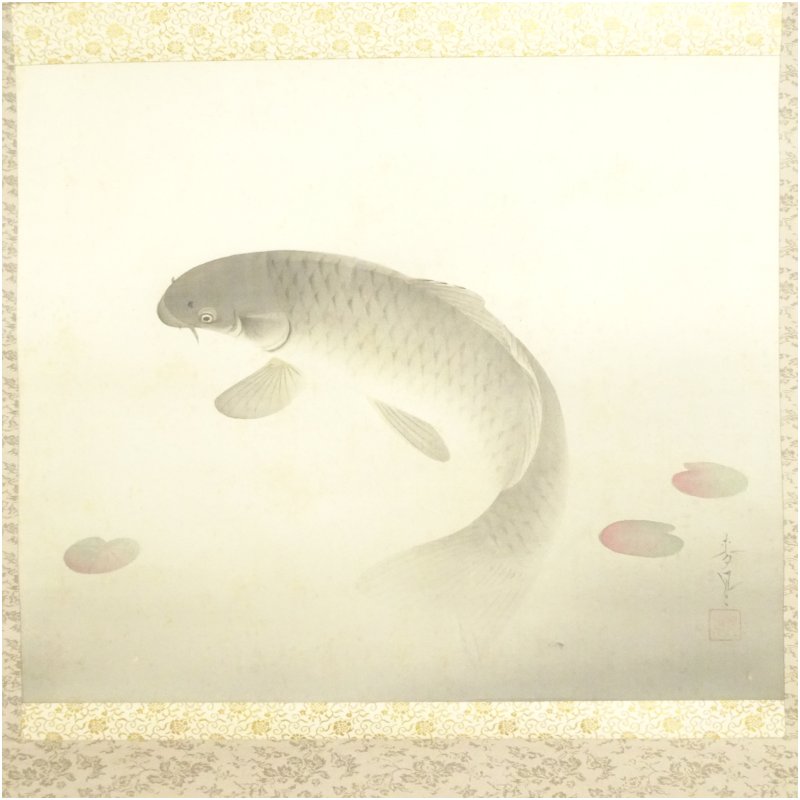 大野麦風筆 游鯉 肉筆絹本掛軸(共箱・二重箱) [14-251113b-034a]