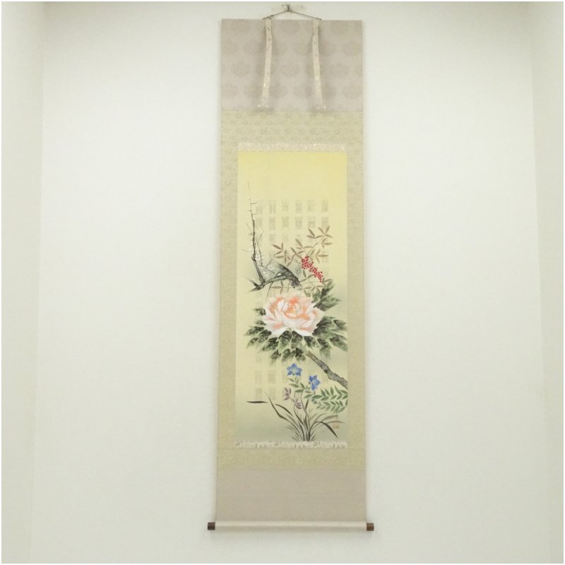 芳春筆 鎮宅守護四季花 肉筆絹本掛軸(共箱) [01-251113b-042a]