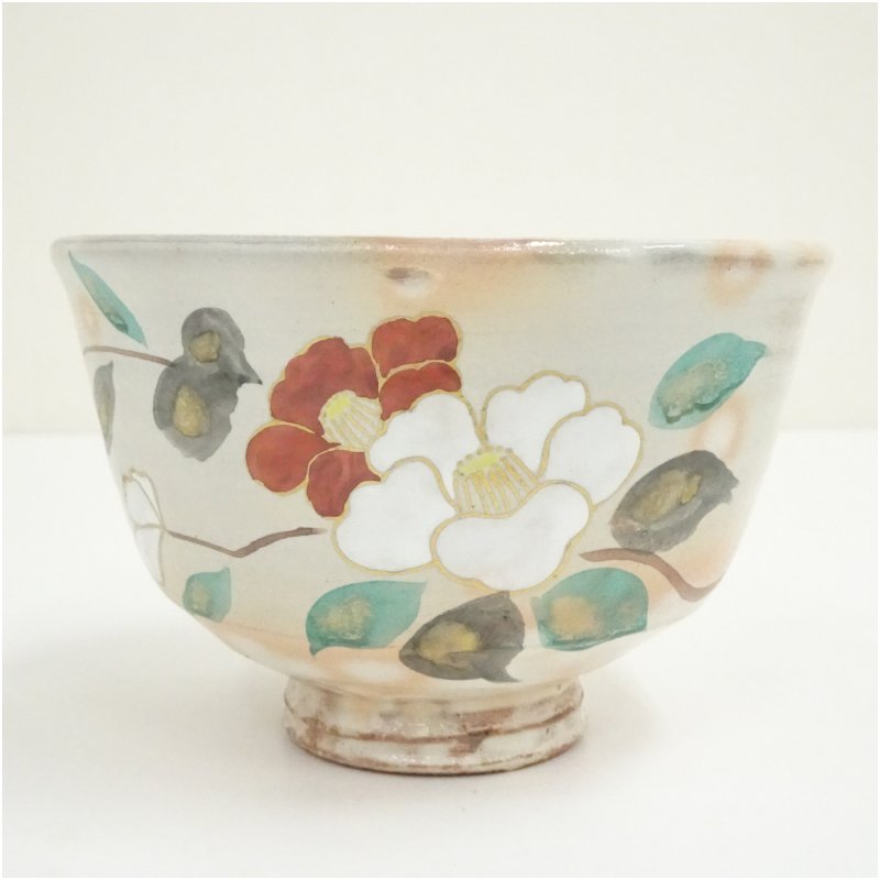 京焼 中村与平造 色絵椿茶碗(箱付) [01-251117d-035a]