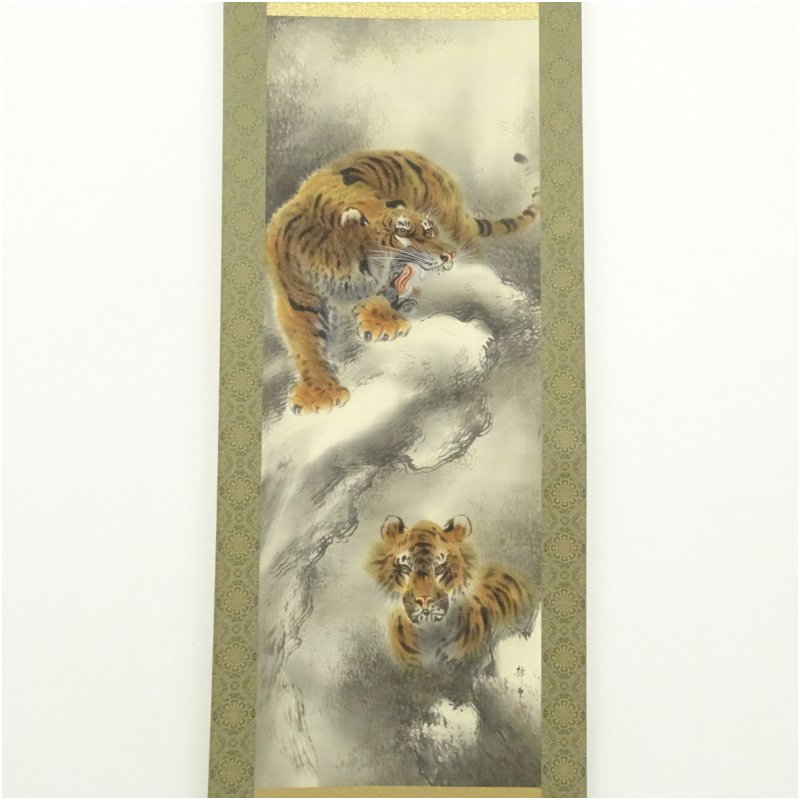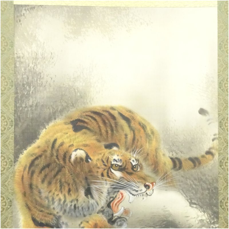 静堂筆 猛虎図 肉筆絹本掛軸(保護箱)