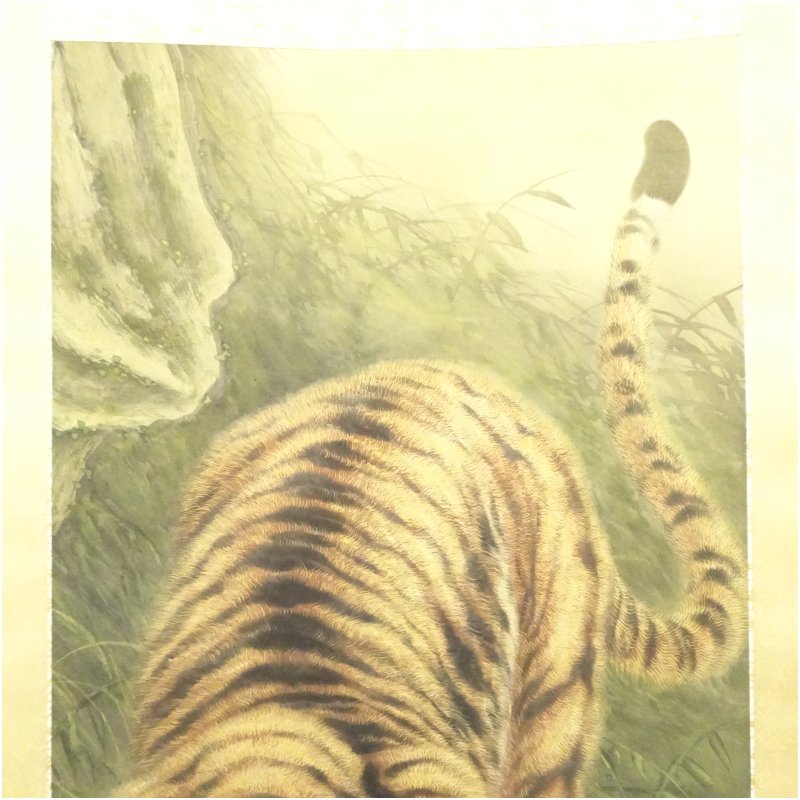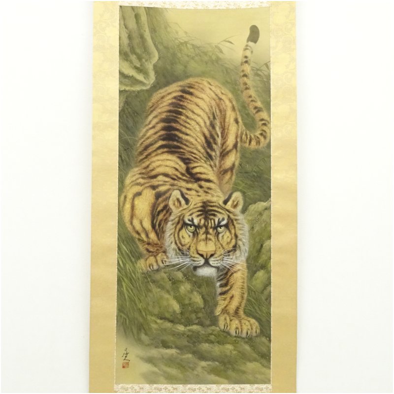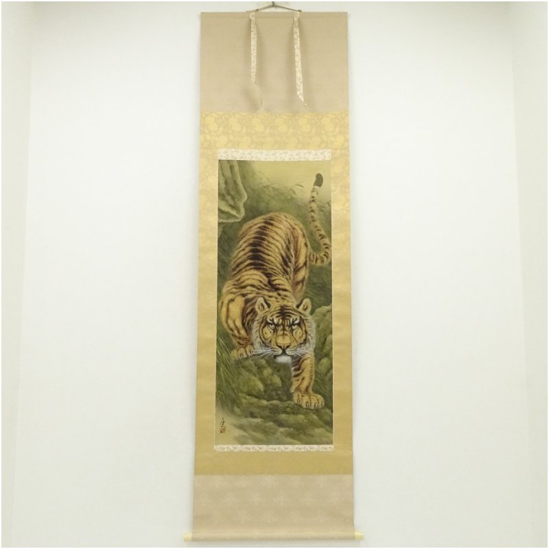 松原日沙史筆 猛虎図 肉筆絹本掛軸(共箱・二重箱) [01-251118b-104a]