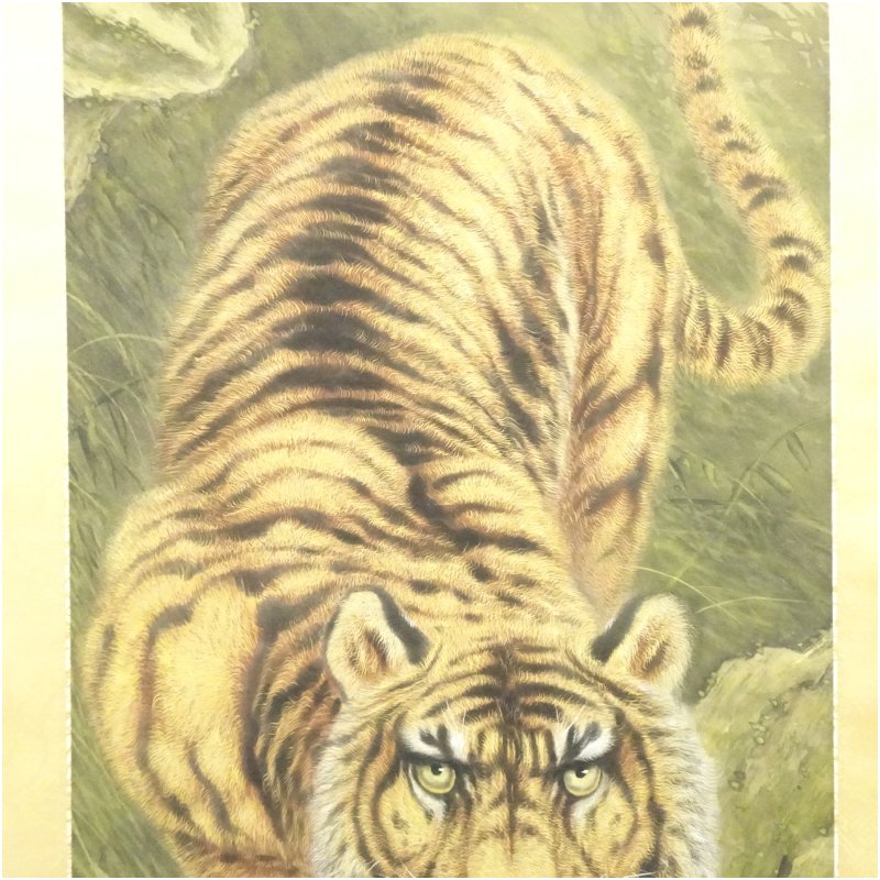 松原日沙史筆 猛虎図 肉筆絹本掛軸(共箱・二重箱)