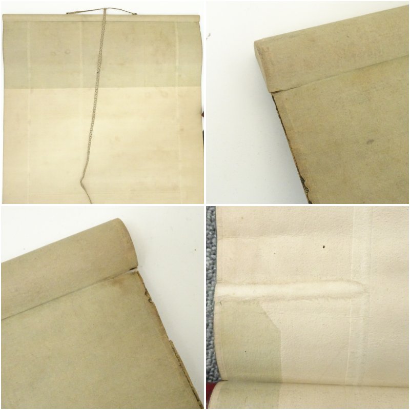本紙と表具両面に全体的にシミ、剥げ、破れ等の経年による劣化があります。