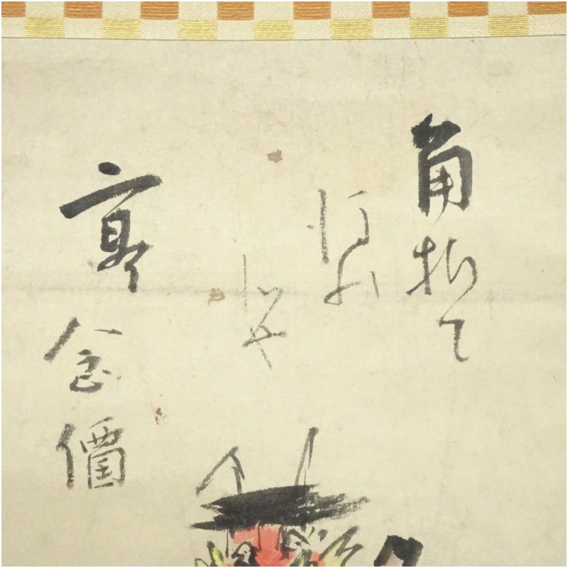 箱書きの「寒念仏」という内容と掛軸の内容は合致しますが、「鈴木真年」という作家名と記名落款は一致しているのか不明なため、商品タイトルでは、「松柏筆」「保護箱」としています。