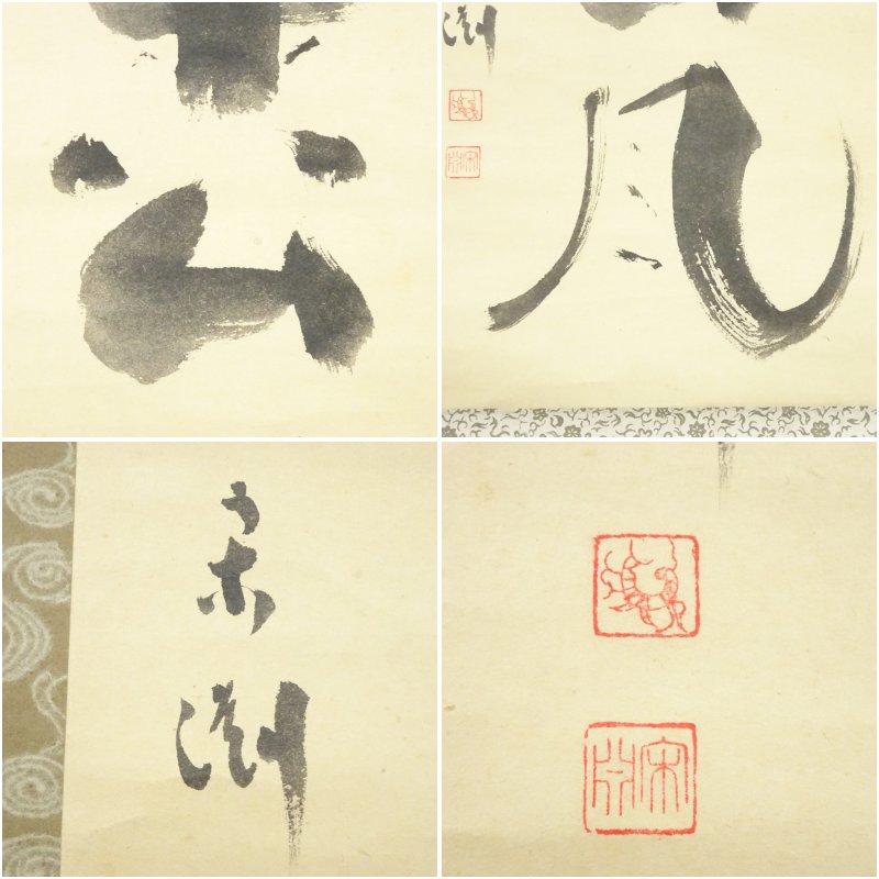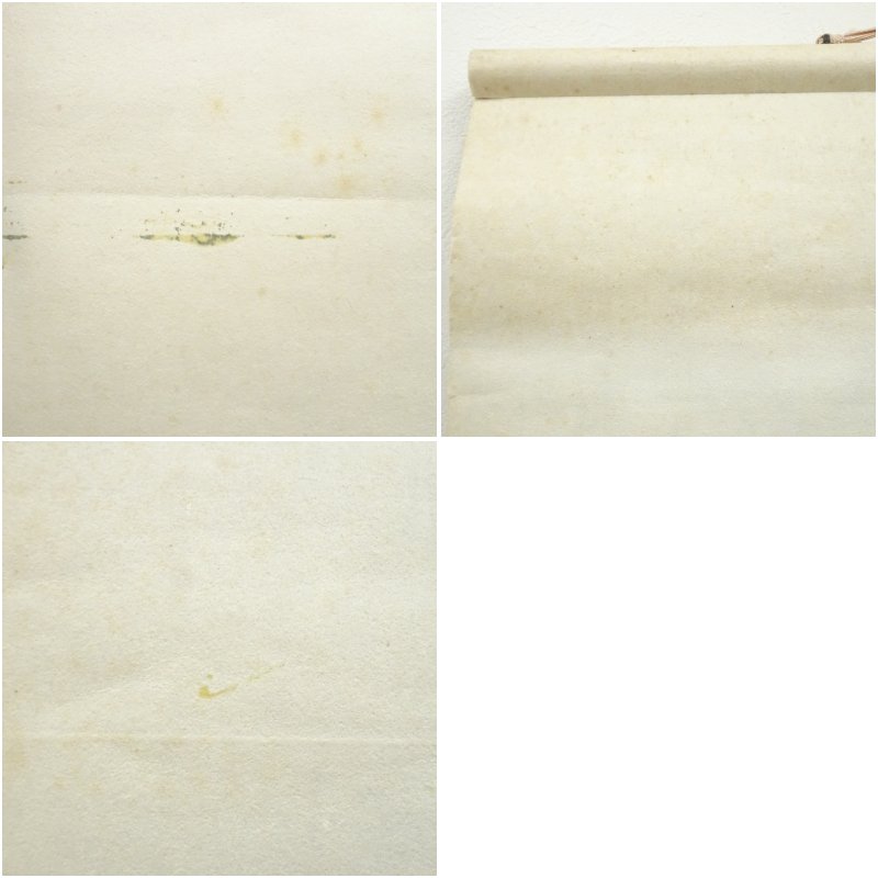 表具:一文字にシミがあります。全体に点々とした小さな薄いシミがあります。巻き皺による折れが数ヶ所あります。裏面上部にヤケがあり、その他全体に多少のシミや汚れがあります。