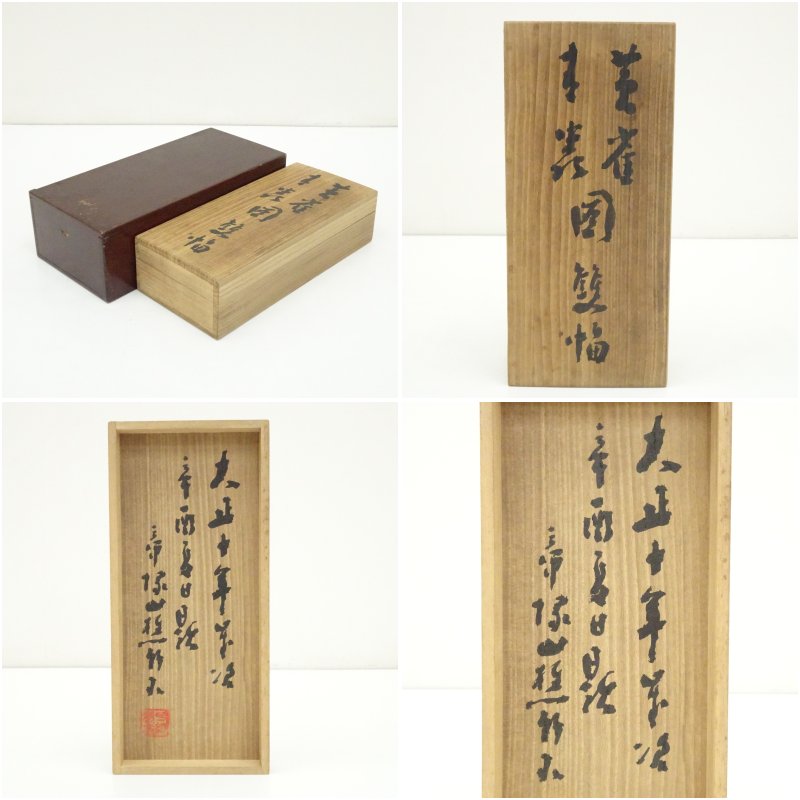 1921年 姫島竹外筆 雀・飛蝗図 双幅 肉筆絹本掛軸(共箱・二重箱)□z [14-251118c-059d]
