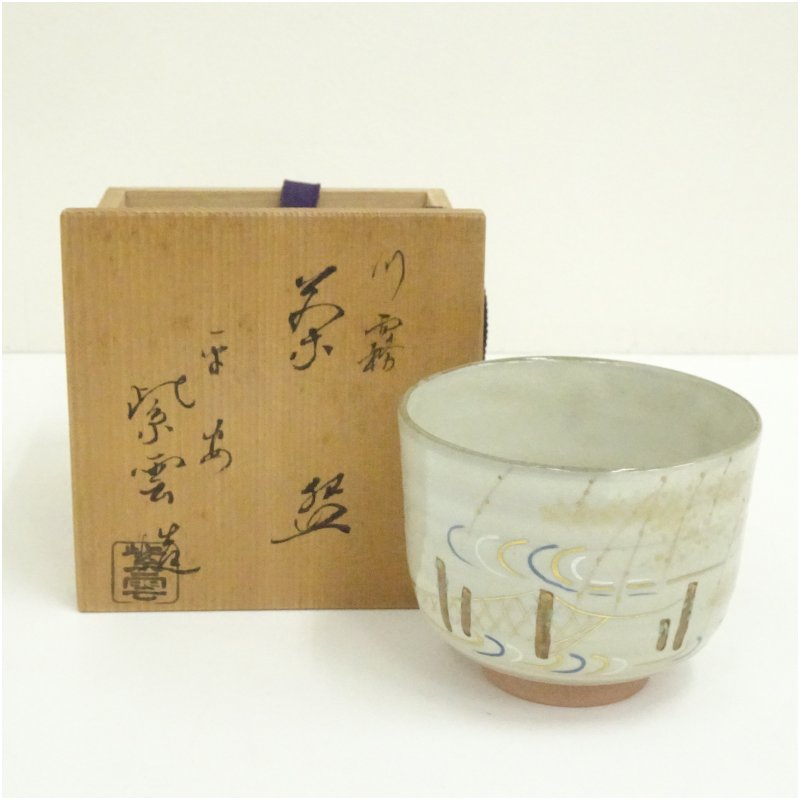 京焼 橋本紫雲造 色絵川霧筒茶碗(共箱)