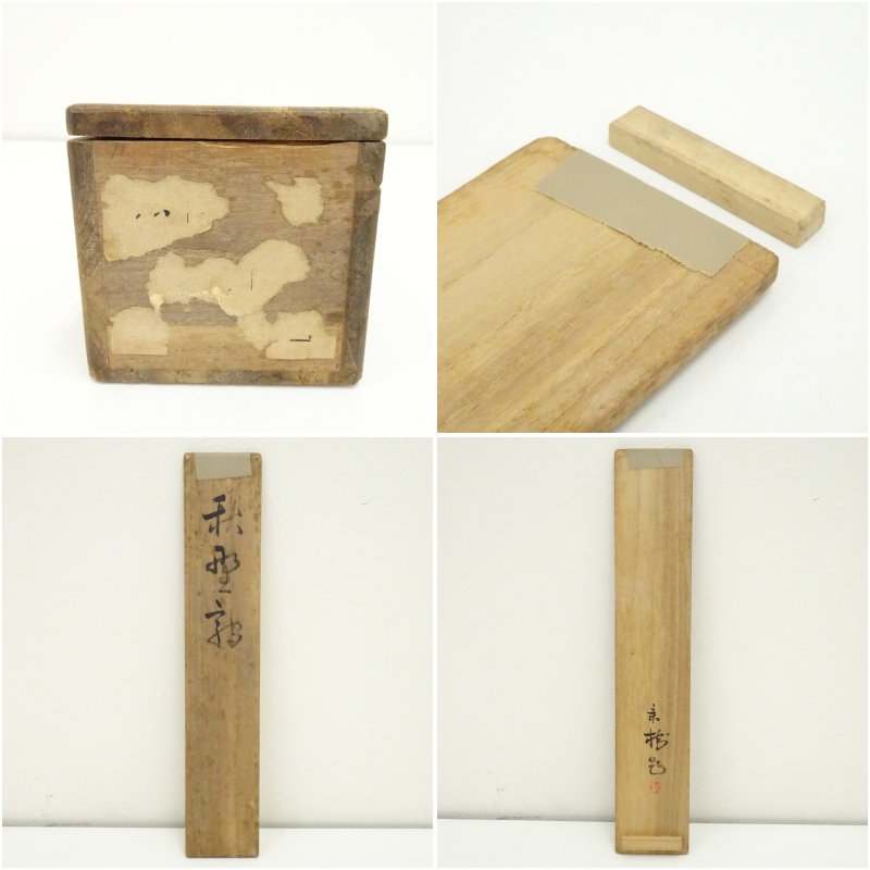木箱:シミがあり、側面に貼り紙があります。蓋の桟が1本外れており、ガムテープが貼ってあります。