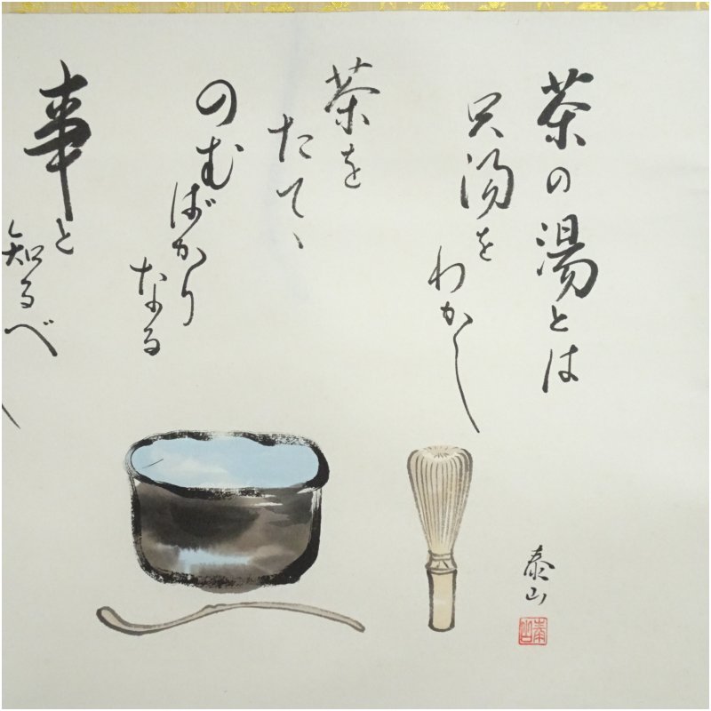 野崎泰山筆 茶の湯とは 画賛 肉筆紙本掛軸(共箱)