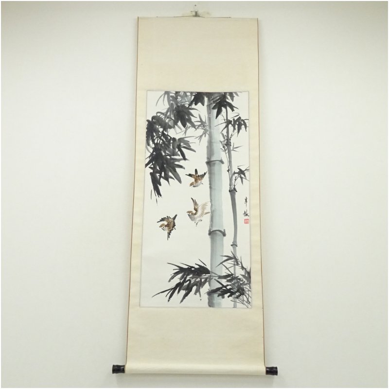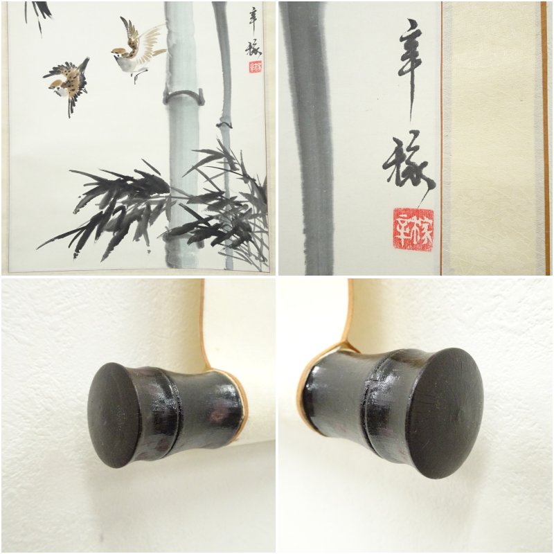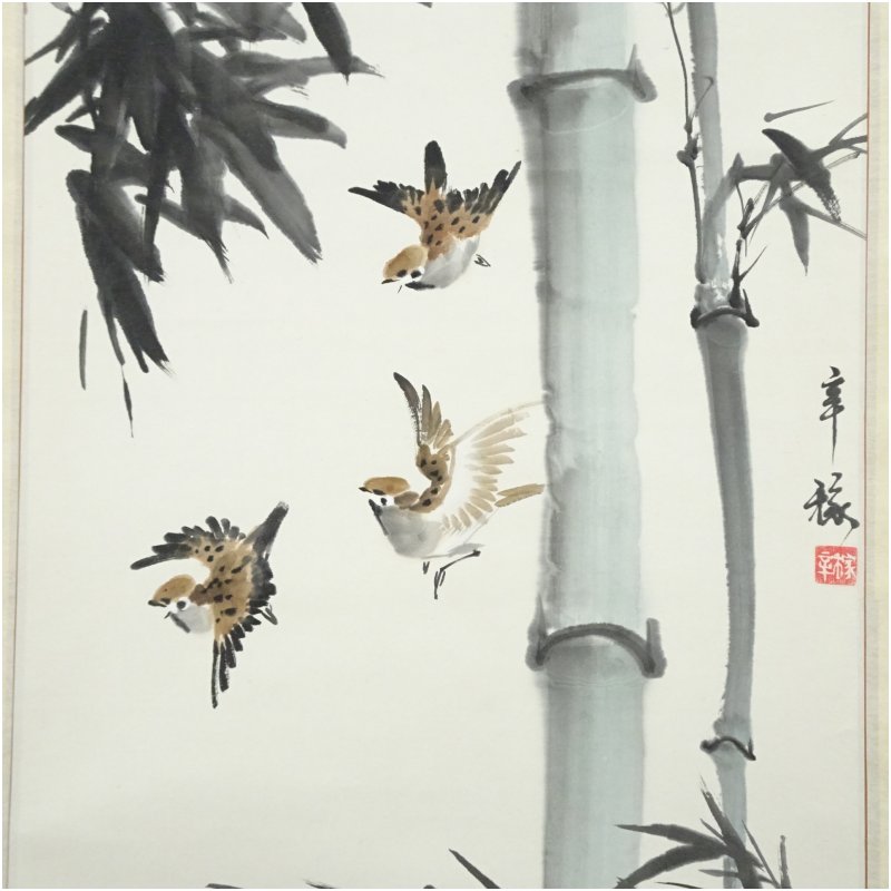 辛架筆 竹に雀 肉筆紙本掛軸 [01-251127b-025a]