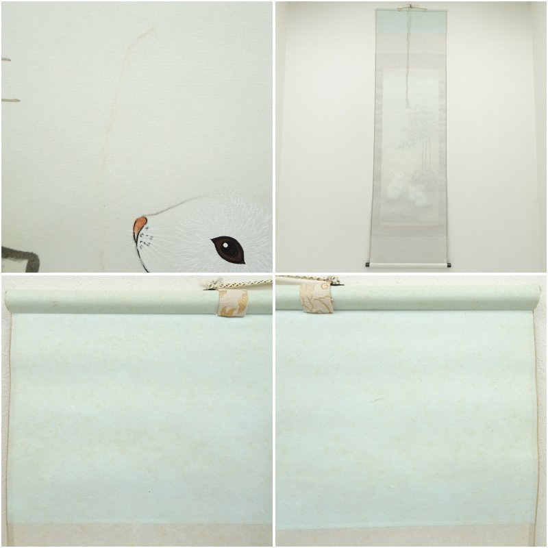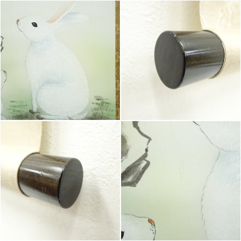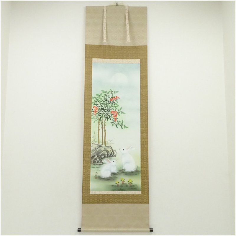 尾崎春秋筆 南天福寿に白兎 肉筆絹本掛軸(紙箱)