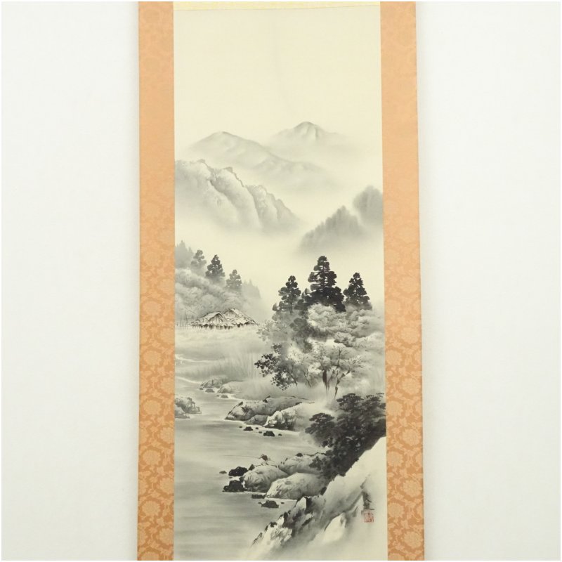 小林文雄筆 水墨山水 肉筆絹本掛軸(共箱) [01-251127b-039a]