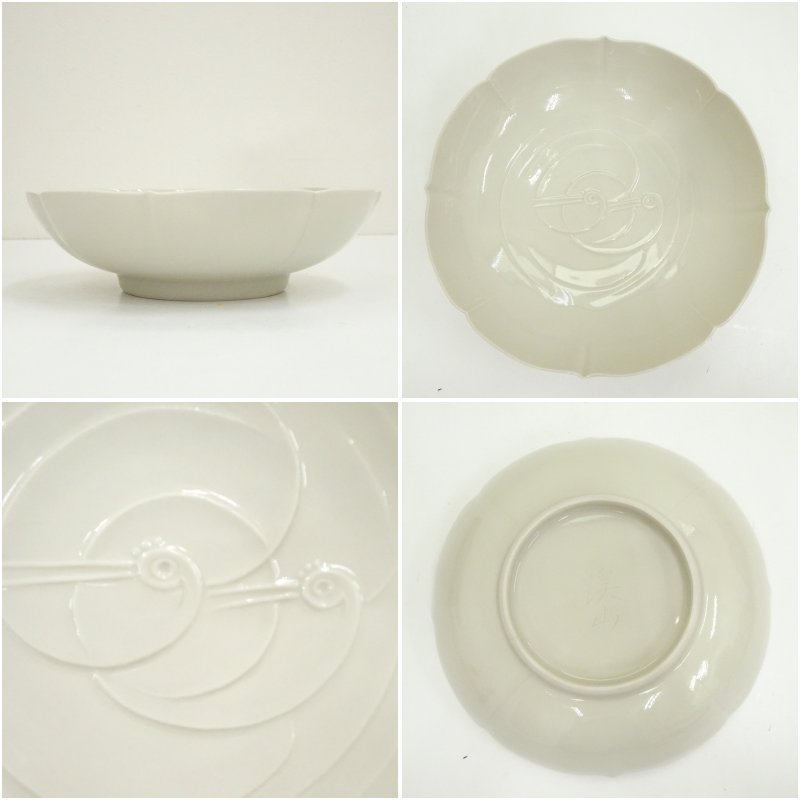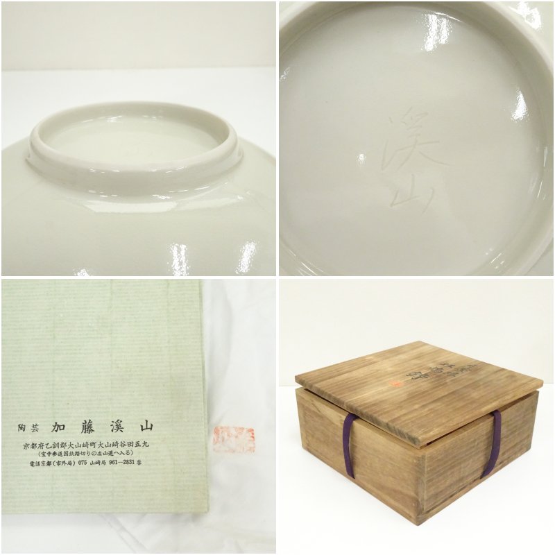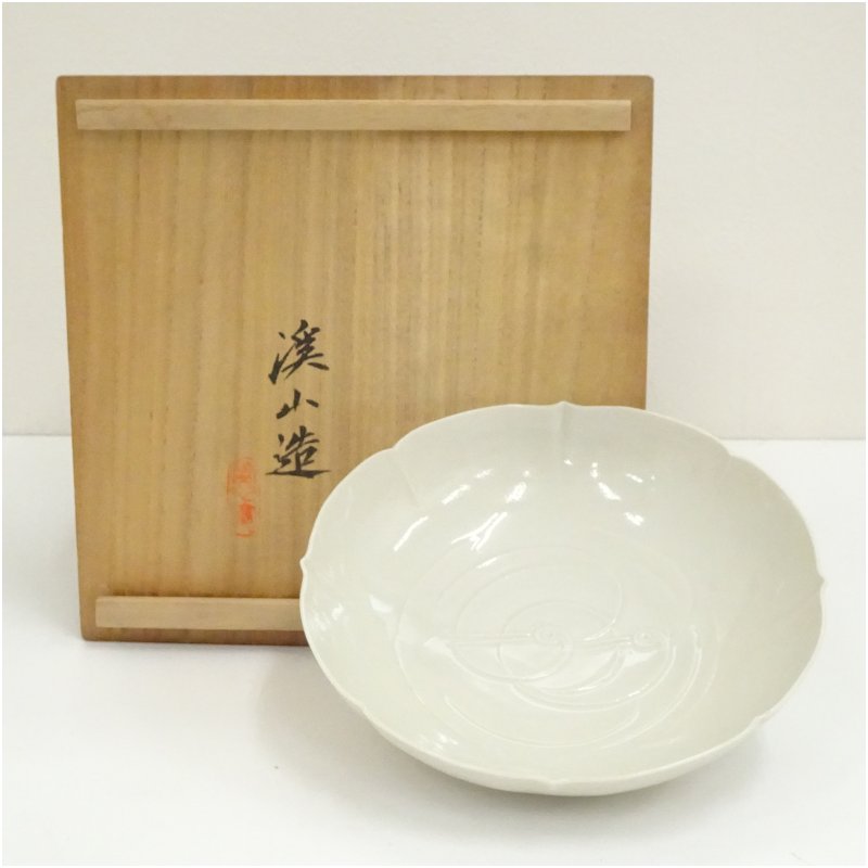京焼 加藤渓山造 牙黄磁双鶴鉢(共箱)