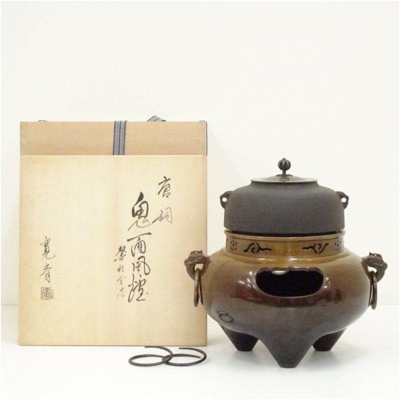 唐銅風炉師 釜谷寛斎・釜師 増山馨鉄造 唐銅鬼面風炉(共箱)